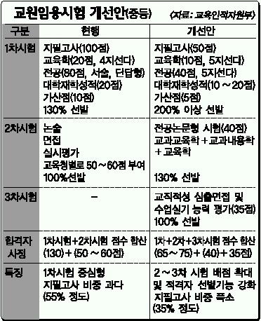 교원 선발방법도 바뀐다.2008학년도 임용시험부터 현행 2단계 전형이 3단계로 늘어난다.1단계 교사로서의 기본능력,2단계 교직 전문성,3단계에서는 교직관을 중점 평가한다.