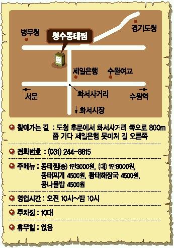 경기도 수원시 장안구 화서동 ‘청수 동태찜’ 전문점은 깔끔한 별미를 맛보려는 손님들로 항상 붐빈다. 다른 곳에서 흔히 접할 수 있는 아귀찜 맛과 비슷한 동태찜으로 생각하면 오산이다.
