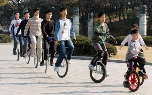 서울 올림픽공원 평화의 문(남4문) 광장. 휘청휘청, 기우뚱기우뚱 외발자전거를 아슬아슬하게 즐기는 사람들이다. 제자리에서 앞뒤로 왔다갔다하고 뱅글뱅글 돌기도 한다. 난간을 붙잡고 타는 초보도 눈에 보인다.