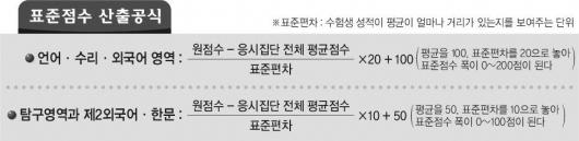 표준점수는 응시 영역과 과목의 응시자 가운데 자신의 성적의 상대적인 위치를 나타내는 점수다. 수험생 개인의 원점수에서 계열별 전체 응시생의 원점수 평균을 뺀 값을 해당 과목의 표준편차로 나눠 산출한다(표 참조). 올해 성적통지표에 표준점수만 공개하고 원점수와 총점 등을 제공하지 않는 이유는 모든 영역과 과목이 ‘선택’으로 바뀌어 과목마다 응시하는 학생이 서로 다르기 때문이다.