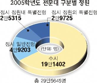 정원내 입학정원은 26만 5920명으로 지난해에 비해 1만 1303명 줄었다. 각 전문대는 지난 9월부터 수시모집을 통해 정원의 72%인 19만 1402명을 이미 선발, 일반·특별전형과 주·야간 모집을 합쳐 정시모집에서는 모두 7만 4518명만을 뽑을 계획이다. 지난해 정시모집에서 선발하려던 17만 3937명과 비교하면 10만여명 가까이 줄었다. 이는 전문대의 수시·정시모집의 비중이 지난해 5대 5에서 올해 7대 3으로 바뀐 데 따른 것이다.