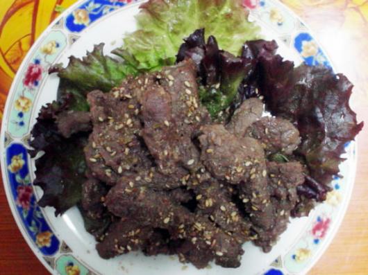 ③배 즙에 재운 고기를 잘 걷어서 양념장에 버무려 두었다가 20분 후에 팬에 익힌다.