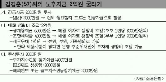 지난해 중소기업 임원을 하다 퇴직한 김경훈(57)씨는 현재 아파트 관리인으로 일하고 있다. 자녀는 모두 출가했고, 퇴직금 등을 모아 3억원 정도의 노후자금도 마련했다. 새 일자리를 얻어 소액이지만 월 수입도 있기 때문에 당분간 저축도 더 하려고 한다. 노후에 자식에게 기대지 않고 편안한 생활을 하려면 재테크를 해야 하지만, 돈을 안전하게 굴리는 것이 쉽지는 않다.