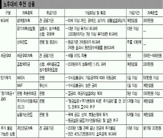 비과세 생계형저축 가입은 필수다. 지난해 7월부터 가입 대상이 65세 이상에서 60세 이상으로, 가입 한도는 200만원에서 3000만원으로 늘었다. 신협과 새마을금고, 농·수협 단위조합에서 판매하는 조합예탁금도 은퇴후 생활비 조달에 유용하게 쓰일 수 있다. 조합예탁금은 1년 이내로 단기투자해도 2000만원까지 이자소득세가 면제되는 등 세금혜택을 받을 수 있지만 오는 2006년 말까지만 가입이 가능하다.60세 이상 남성과 55세 이상 여성이라면 6000만원까지 가입할 수 있는 세금우대저축도 고려할 만하다. 비과세가 적용되면서 연 6∼9%의 금리를 추구할 수 있는 선박펀드도 여윳돈 투자처로 각광받고 있다. 원금 기준으로 3억원까지 비과세 혜택을 받으며 3억원이 넘으면 분리과세된다.