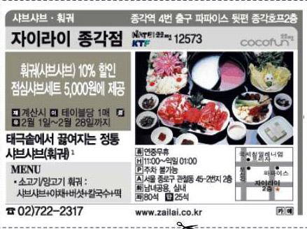 아울러 설날과 어울리는 전통 찻집과 떡집, 설날의 즐거움을 더해주는 노래방 할인 쿠폰도 함께 마련했습니다. 신문에 게재된 쿠폰은 서울신문 홈페이지(www.seoul.co.kr)에서 인쇄해 사용할 수도 있습니다.