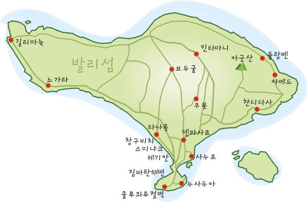 인도네시아의 작은 섬 발리는 아름다운 바다와 푸른 하늘, 부담 없는 가격의 호텔로 많은 이들의 사랑을 받는 곳. 제주도 3배 크기의 섬으로 곳곳에 깨끗한 해변이 펼쳐져 있고, 내륙에는 태곳적 원시림을 간직한 산과 계곡이 널려 있어 휴식과 놀이를 만끽하기에 더없이 좋은 장소다.