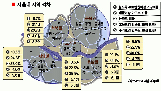 거대도시로 성장한 서울의 이면에는 소득격차로 인한 지역격차의 그늘이 드리워져 있다.2004 서울서베이에 따르면 특히 강남·서초구 등이 포함된 서울의 동남권(강남·서초·송파·강동)은 월소득 400만원 이상 가구의 비율이 20.1%로 서울 전체평균(11.8%)의 두배에 달했다. 주택 중 아파트비율도 동남권은 51.8%로 서울 평균 38.5%보다 높아 주거환경도 우수한 것으로 나타났다. 그뿐만 아니라 동남권 주민들의 교육환경만족도·주거환경만족도 등이 다른 지역보다 상대적으로 높게 나타났다.