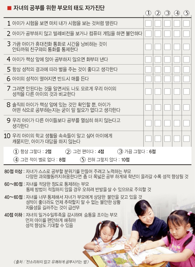 그러나 이렇게 성적에 일희일비하고 조급한 모습을 보이는 것은 장기적으로 볼 때 자녀의 실력을 키워주는 데 도움이 안된다고 한다. 왜 공부를 해야 하는지 자연스럽게 깨우쳐 주고 공부와 친숙한 환경을 만들어 주는 것이 근본적인 방법이다. 자녀들에게 좋은 공부습관을 들여주기 위해 부모가 알아야 할 점들을 전문가들에게 들어봤다.