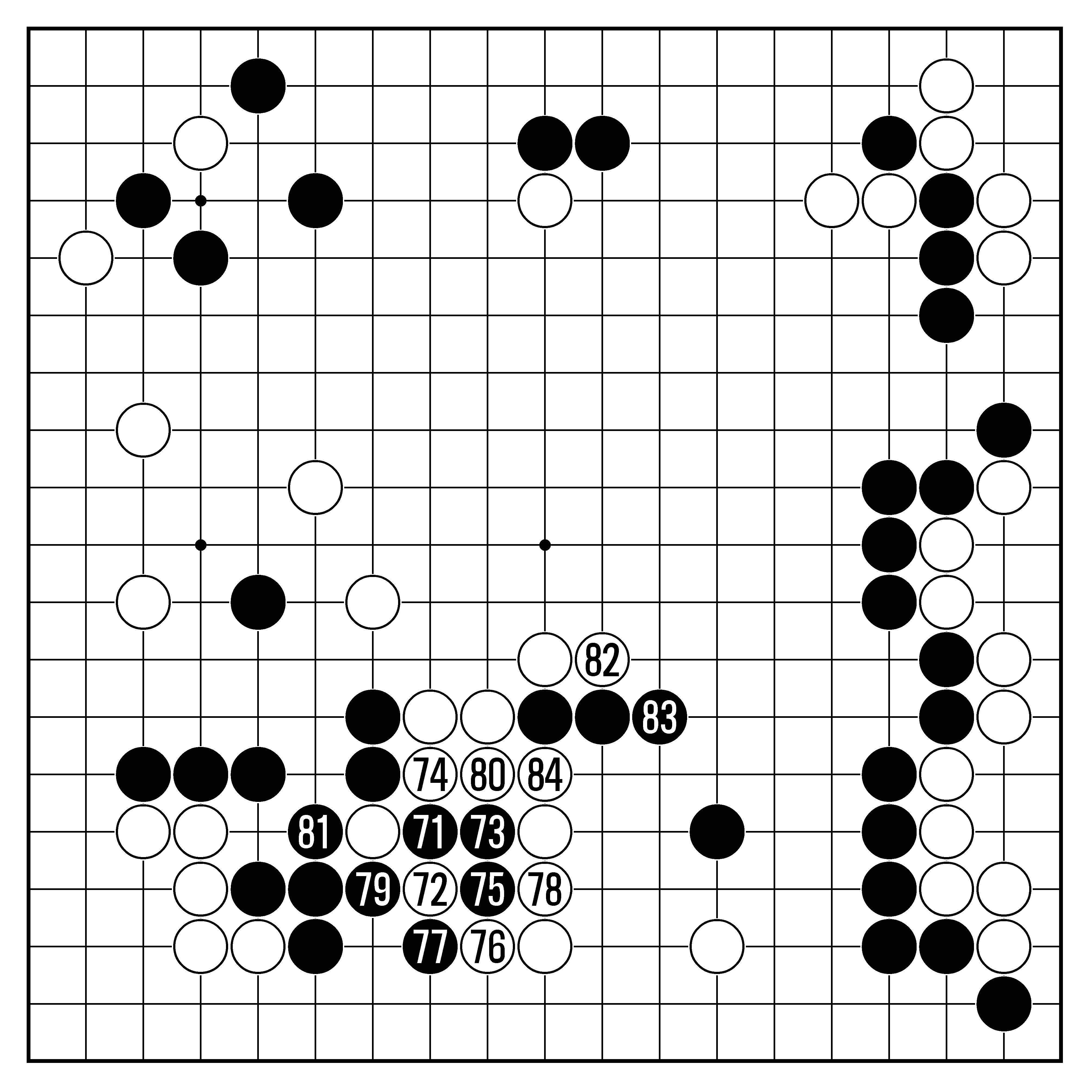 제6보(71∼84) 흑 71로 백 한점을 제압하면서 백돌을 끊자고 한 장면부터 다시 살펴보자. 사실 대국자의 입장에서 볼 때 이런 수를 두는 사람은 더 없이 기분 좋고, 당하는 사람은 매우 기분 나쁘다.