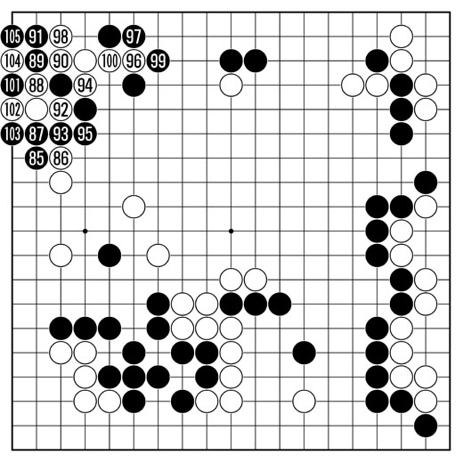 그러나 백 96의 응수타진에 이어 100으로 이은 수가 턱없는 무리수였다. 이 수는 흑의 포위망에 단점을 남겨 놓겠다는 뜻인데, 흑이 101부터 105까지 패를 만들어 좌상귀 백 대마를 미생으로 만들자 갑자기 백이 곤란해졌다.