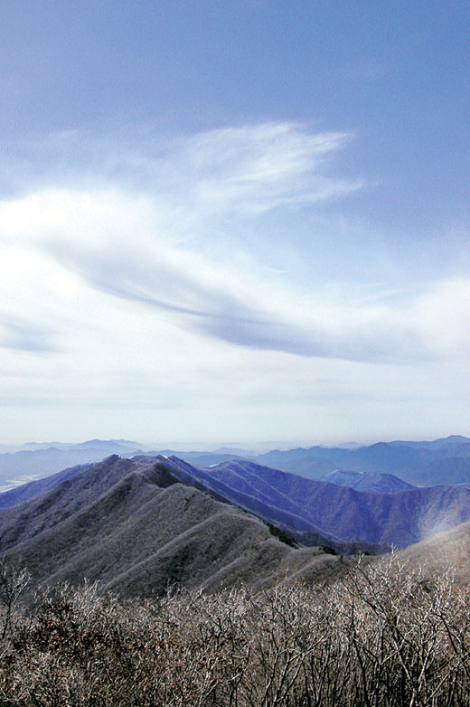 삼거리로 되돌아오면 이제부터 본격적인 능선산행이 시작된다. 인적 드문 호젓한 길이 이어지고 중간중간 시계가 트인 곳에서 바라다 보이는 지리산은 경외심을 품게 할 정도로 웅장한 모습이다.
