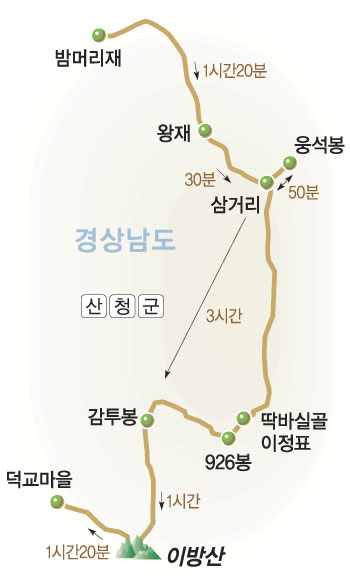 산길은 59번 지방도가 지나가는 밤머리재(산청 삼장면, 금서면)를 출발하여 웅석봉에 오른 뒤, 다시 능선 갈림길(삼거리)로 되돌아와 감투봉∼이방산을 거쳐 덕교마을(삼장면)로 하산하는 코스로 잡았다.