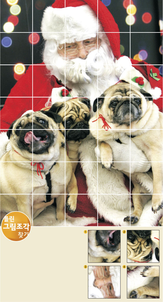 벌써 크리스마스 시즌이 돌아왔네요. 마음씨 좋은 산타할아버지가 선물 대신 강아지를 들고 나타나셨군요.We에서는 겨울철 건강을 위해 웰빙 선물을 드립니다. 바로 ‘청국장!´ 우리 몸에 청국장이 얼마나 좋은지는 12면에 자알∼ 나와 있고요. 옥황토방에서 만든 청국장을 파는 콩예원(www.congyewon.com,02-990-2030)에서 우리 콩으로 만든 청국장을 쏩니다. 먹기 편하게 환과 분말로 가공한 청국장 각각 250g씩 담긴 세트(2만 6000원)를 보내드립니다. 옆 사진조각중 원본과 다른 조각을 붙여 크리스마스 카드를 보내 주세요. 예쁜 카드를 뽑아 다섯 분께 청국장을 드리고,We 크리스마스 특집에 카드를 실어 드립니다.