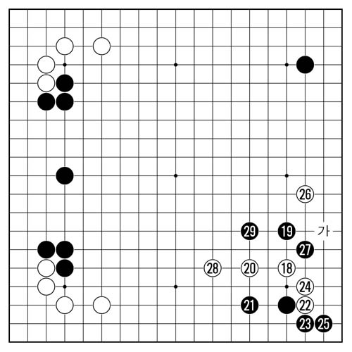 손을 뺀다면 모를까, 받는다면 백 20의 한칸 뜀이 사실상의 절대수이다. 이하 24까지는 필연의 수순인데 이때가 흑에게는 갈림길이다.