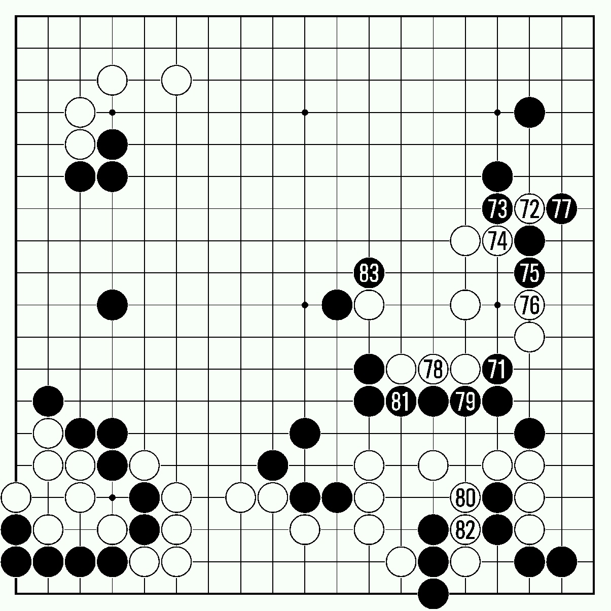결국 윤 4단은 우하귀를 버리는 대신 흑 83으로 우변 백 대마를 잡으러가는 최후의 승부수를 선택했다. 이제는 못 잡으면 진다.