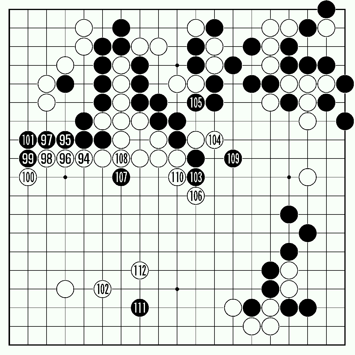 제9보(94∼112) 초반 우상귀 접전에서 흑은 쳐들어왔던 백돌들을 전부 일망타진하는 대성과를 거둬서 단번에 우위를 점했다. 그러나 이어진 백의 대세력작전에 말려들어 중앙 일대에 거대한 백의 세력을 허용했다. 그럼에도 불구하고 아직은 흑이 우세하다. 문제는 흐름이다. 기분 좋았던 흐름이 어느새 조금씩 안 좋은 쪽으로 변하고 있는 것이다.