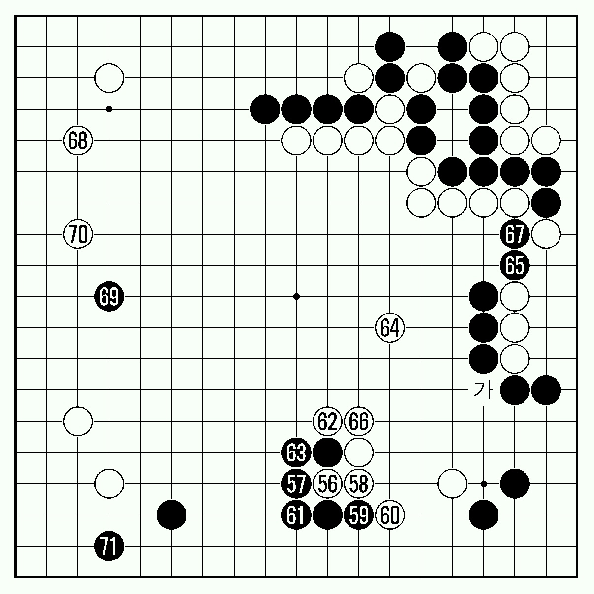 제5보(56∼71) 백56의 끼움수는 오직 이 한수라고 할 수 있다. 상황에 따라서 62의 젖힘이나 66으로 느는 수도 가능할 때가 있지만, 지금은 62로 젖히면 흑66에 끊는 것이 두렵고, 그냥 66에 느는 것은 너무 느슨하다.따라서 백56의 끼움은 강수라고 할 수 있는데 흑은 얌전하게 물러서서 57로 받는다. 이 수로 강력하게 58로 단수 치고 싸울 수는 없을까?