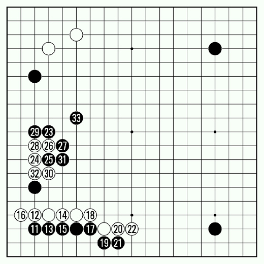 제2보(11∼33) 흑11의 3·三 침입에 백이 막는 방향은 두 가지가 있다.