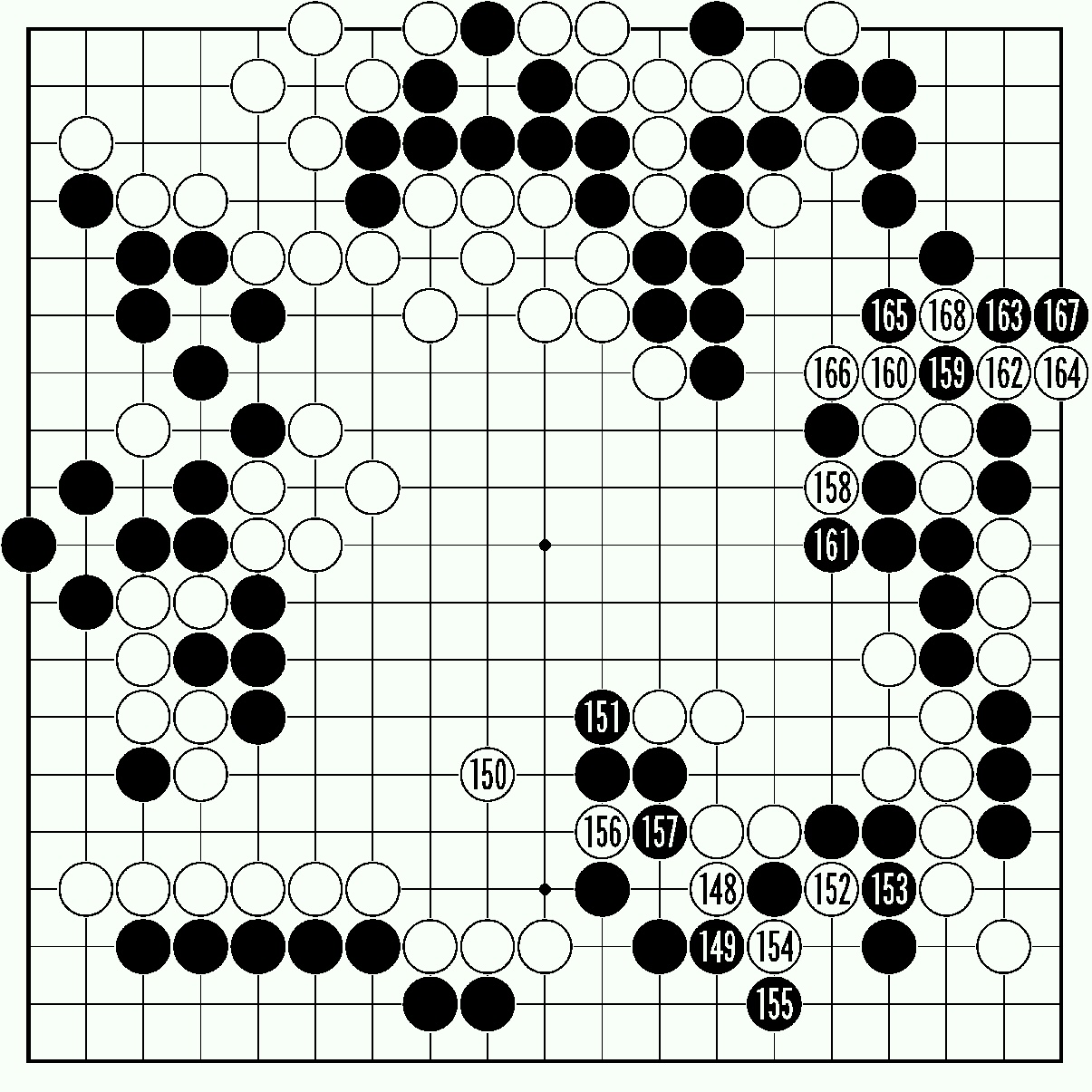그러나 흑159의 착각으로 백160에 나가는 수가 성립하게 됐다. 이4단은 아마 횡재한 기분이었을 것이다.168까지 우변에서도 패가 발생했다. 상변보다 훨씬 더 크고 시급한 패싸움이다. 당연히 형세는 뒤집어졌다.