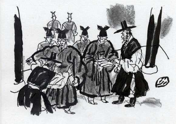 주인으로부터 명령을 받은 선접꾼들이 눈을 부라리고 서서 행여 율곡이 조금이라도 먼저 안으로 들어가는가를 감시하고 있었기 때문이었다.