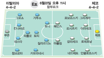 이탈리아와 체코가 22일 밤 11시 함부르크에서 격돌한다. 현재 1승1무와 1승1패로 조 1·2위를 달리고 있지만,16강 티켓을 손에 넣지 못한 것은 마찬가지. 비겨도 최소한 조 2위를 차지할 수 있는 이탈리아가 다소 유리하다.