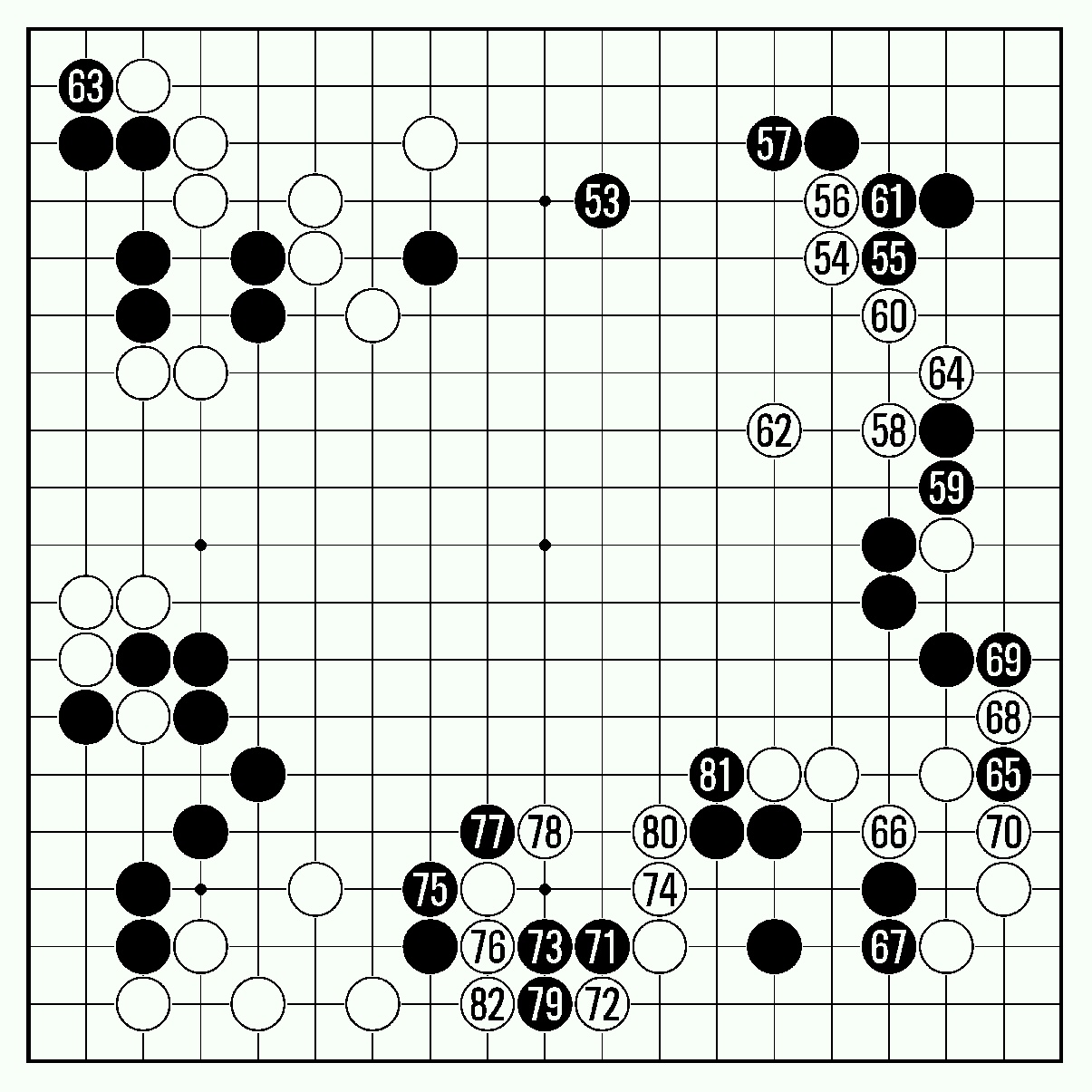 그러나 흑은 또다시 73이라는 최강수를 들고 나왔다. 그러자 백도 더 이상 참지 않고 74로 올라섰다. 그리고 82까지 흑 석점을 가뒀다. 이 석점은 잡힌 것일까?
