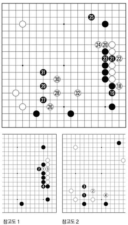 그래서 고심 끝에 원성진 7단은 흑27로 약간 비틀어 받았다.(참고도2)의 진행이라고 해서 흑이 나쁠 것은 없지만 새로운 길을 가보기로 한 것이다.