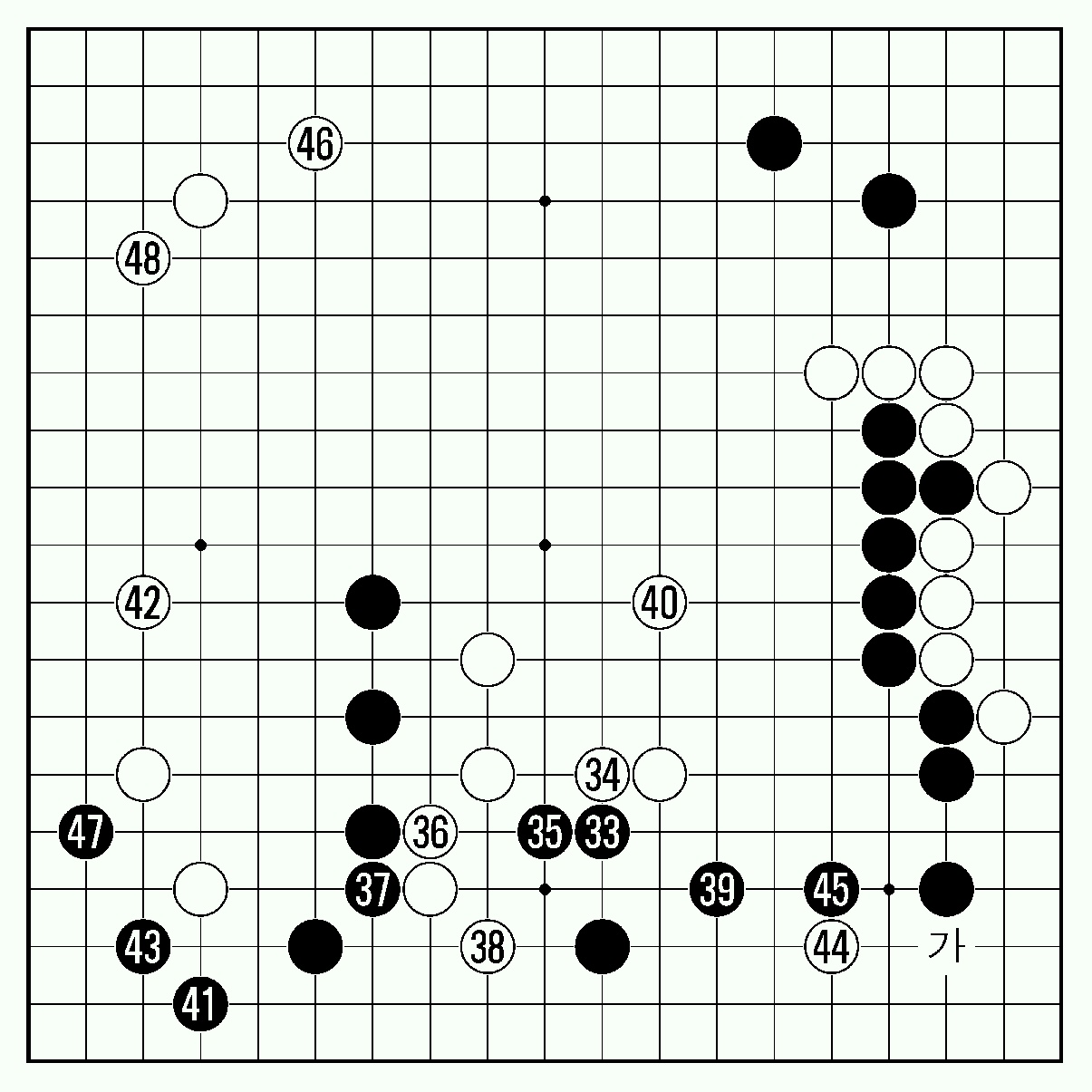 그러나 흑도 37의 곳에 돌이 놓이면서 왼쪽 흑돌들이 튼튼해졌기 때문에 불만은 없다. 더구나 흑41로 귀를 미끄러져 가서 실리의 손해도 별로 없다.