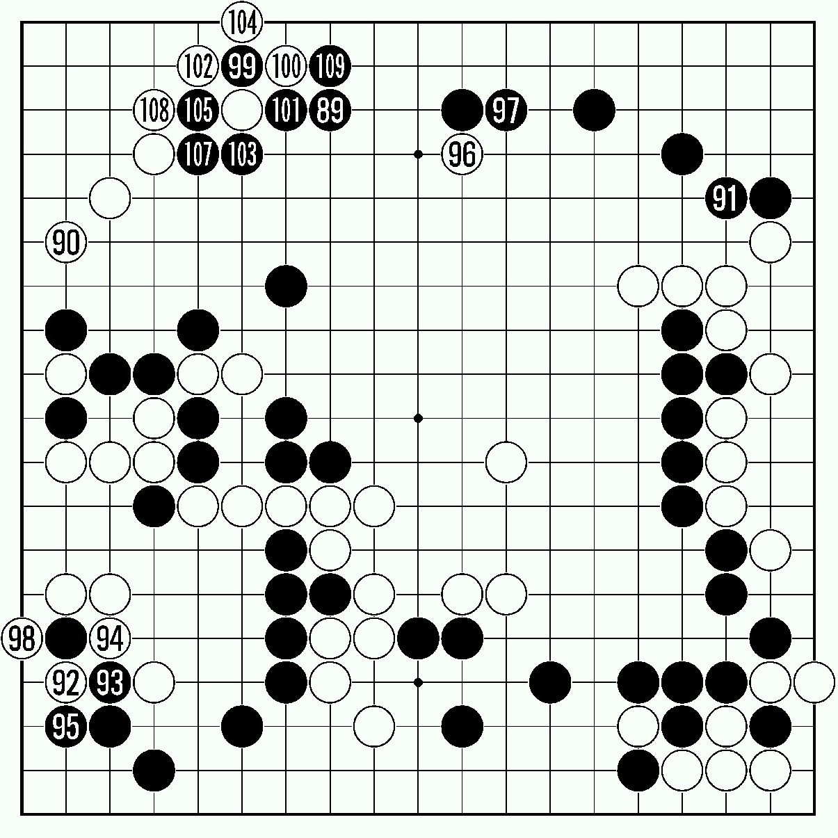 제6보(89∼109) 좌변에서 전과를 올린 원성진 7단은 흑89로 기분 좋게 벌린다. 반상 최대의 곳인 동시에 좌상귀 백의 약점을 노리고 있는 수이다.