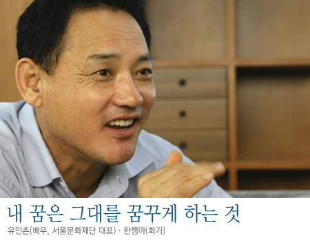 유인촌 특별한 것은 없어요. 강원도의 ‘봉평예술극장’을 좀더 친환경적인 예술공간으로 만들어야겠다는 생각이 있고.... 참, 강남에 있는 ‘유씨어터’는 그간 연극만을 위한 공연장이었는데 앞으로는 예술계 전반의 ‘사람’을 담을 수 있는 공간으로 변모시켜나가려 해요. 결국 사람이 중요한 건데, 지금은 문화예술계가 지나치게 분화되어서 발전적인 교통이 잘 안 되는 감이 있어요. 예전에는 모두가 함께 어울렸어요. 문득 옛날 생각이 나는군요. 그때 명동 엘리자베스 다방에 가면 문학, 영화, 미술, 사진 하는 분들이 모여서 설전을 벌였어요. 말이 되든 안 되는, 대화 속에서 영향을 주고받았던 거지요. 문학이 미술에서 한수 배우고, 미술이 연극에서 영감을 얻는 거죠. 그렇게 내면적으로 상향조정되는 공간이 필요한 것 같아요. 그리고 개인적으로도 사람들을 모을 수 환경과 공간을 갖고 싶어요. 모여서 의논도 하고 작품도 하고 또 다른 사람의 작품을 봐주기도 하고....그런 것들을 준비하고 싶어요. 전시 한 번 하려면 돈이 많이 드는데, 경제적으로 어려운 역량 있는 젊은 예술가들에게 공간도 내주고... 그게 선배된 사람들의 의무인 동시에 내 작은 꿈이기도 하겠지요.