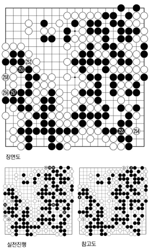 참고도 원래는 실전 백254로 상변 1,3의 젖혀 잇는 끝내기를 하는 것이 옳다. 그러면 흑이 4로 좌변을 보강하고, 이때 흑5로 이어서 종국이다. 이 계가는 흑의 1집반 승리. 원 7단이 실전에서 변화를 구한 이유다.