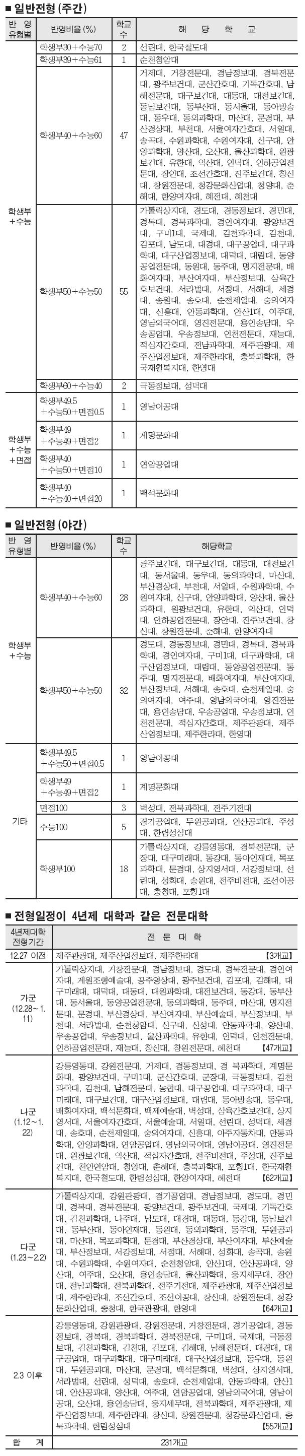 정시모집에서 가장 큰 비중을 차지하는 일반전형에서는 주간 3만 5056명, 야간 3691명을 모집한다. 주간의 경우 107곳이 학생부와 수능 성적을 반영한다. 경기공업대와 농협대, 두원공과대, 안산공과대, 웅지세무대 등 9곳은 수능만으로 신입생을 뽑는다.