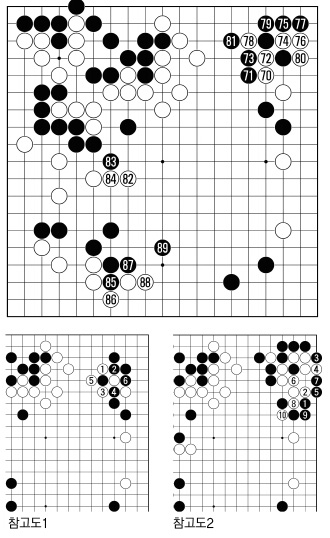 백이 손을 뺐지만 (참고도2) 흑1로 백 대마를 잡으러 가는 것은 의외로 잘 안된다. 흑7로 파호할 때 백8로 집고 10으로 끊으면 흑은 어느 한쪽이 다치게 되어 있다. 우상귀에서 큰 이득을 보면서 백도 실리로는 어느 정도 추격에 성공했다. 그러나 형세는 여전히 흑이 크게 앞서 있다. 흑85부터 89까지 좌변 흑 대마를 보강하는 것으로 충분하다.