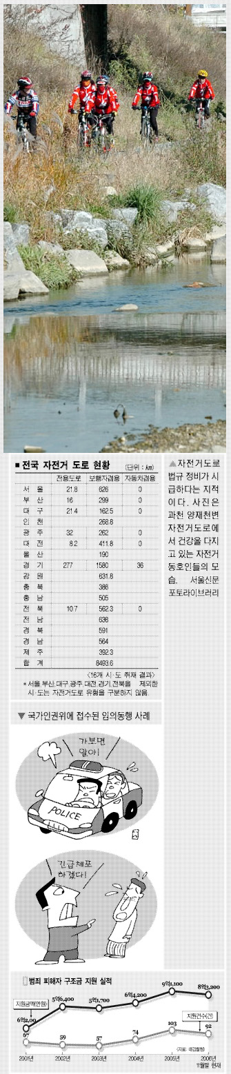 서울 동대문에 사는 김중모(35)씨는 지난주 중랑천 자전거전용도로에서 자전거를 타다가 갑자기 뛰어든 행인과 부딪쳤다. 김씨는 “치료비 전액을 물어줬는데, 보행자 쪽에서 정신적피해보상까지 요구하고 있어 난감하다.”고 말했다. 보행자겸용도로는 물론이고 자전거전용도로에서 자전거보다 훨씬 빠른 속도로 달리는 인라인 스케이트와 부딪혀도 자전거 이용자 책임이다.