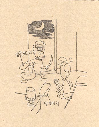 K씨는 전 날 밤 집안에 침입한 강도에게 『다른 것은 다 가져가도 좋으나 단벌신사이니 양복만은 좀 봐달라』고 사정했더니 딱한 사정에 감동(?)한 강도씨가 『날씨가 더워졌으니 저고리만 가져 가겠다』면서 바지는 남겨 주더라는 것.