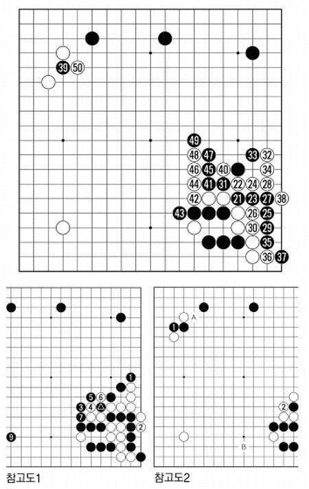최근은 흑39로 축머리를 쓰고, 백40으로 단수 치는 수순이 일반화됐다. 계속해서 (참고도2)처럼 흑1로 돌파하고 백2로 빵따냄을 하는 바꿔치기가 최근의 경향이다.(이후 흑A로 귀를 지킬 수도 있고, 흑B로 하변을 지킬 수도 있다.)