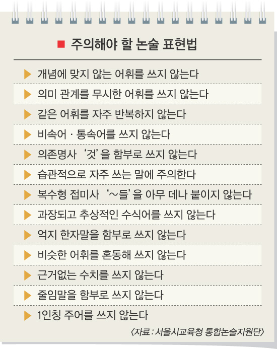 또 하나 주의할 게 있다. 바로 비속어와 통속어를 쓰는 것이다. 우리 친구들이 쓰는 말 가운데 비속어는 적지만 통속어는 아주 많다.‘썰렁하다.’‘즐’, 이런 말은 당연히 안 된다. 보편화됐다고 하는 ‘짱’‘대빵’‘되게 많다.’ 등도 사용하면 안 된다. 언론에서 이런 단어를 쓰는 경우가 있지만 논술에서 사용해서는 안 된다.
