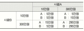 따라서 B가 10만원을 부른다고 생각될 때 A는 10만원이나 300만원이나 자신이 받을 수 있는 보상액의 차이는 없다. 이와 반대로 B가 300만원을 부른다고 생각될 때 A는 10만원을 부를 때와 300만원을 부를 때 가운데 300만원을 부를 때 이익이 더 크게 생각될 것이다. 따라서 A는 300만원을 청구하는 것이 맞을 것이다.