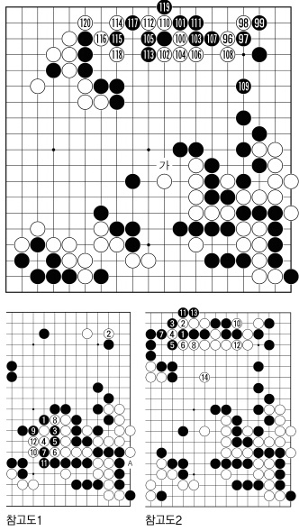 흑113으로는 (참고도2) 1에 늘면 상변 백돌은 잡을 수 있지만 12까지 완벽하게 죄어 붙인 뒤에 (흑9는 4의 곳 이음) 14로 뛰어나오면 도저히 잡을 수 있을 것 같지가 않다. 따라서 흑113은 기세의 반발. 그 결과 120까지 바꿔치기가 됐는데 이 교환은 누가 이득일까?