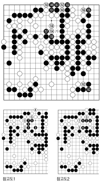 160,162는 묘수를 찾아보기 위한 시간 연장책이었으나 결국 자신의 패배를 재차 확인하는 절차에 불과했다.163다음 백이 가로 잡으러 가는 것은 <참고도2>의 수순으로 흑이 살아간다.