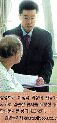 자동차보험 대인보상팀에서 일하고 있는 삼성화재 이상덕(38)과장은 이 같은 전화를 하루에 4∼5건씩 하거나, 받는다.