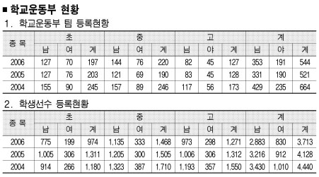 소년체전 분야 지원액은 2005년 7억 8000여만원,2006년 7억 6000여만원, 올해 7억 4000여만원으로 매년 줄어들고 있다.