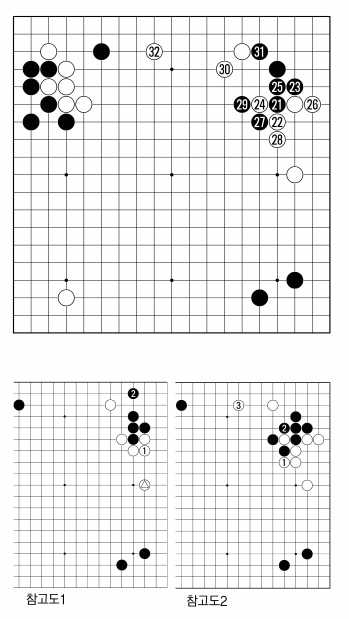 백30은 <참고도2> 백1로 단수치는 것이 일감으로 떠오르는 곳이기도 하다. 그러나 허영호 5단은 백3까지의 진행이 다소 엷어 보인다고 판단한 듯하다.