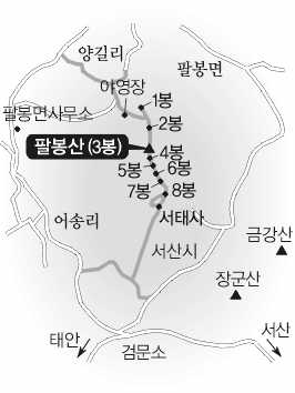 강원도에 홍천 팔봉산이 있다면 충청도엔 서산 팔봉산이 있다. 금북정맥의 끝자락에 위치한 팔봉산(八峯山·362m)은 그동안 알려지지 않다가 최근 백두대간에 이은 정맥과 지맥 종주 붐이 일면서 인기가 높아지고 있다.