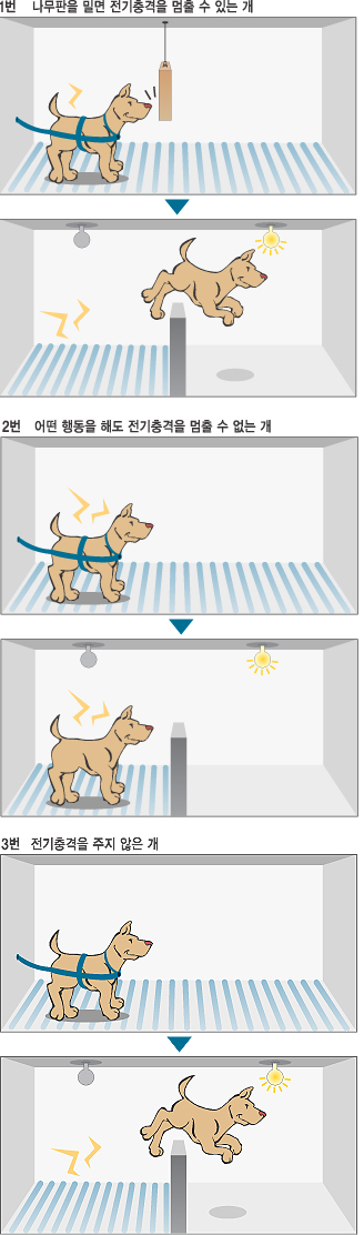 놀라운 결과가 나왔습니다.1번과 3번 우리의 개들은 한두 차례 정도는 멋모르고 전기 충격을 받았지만 곧 어떻게 하면 이를 피할 수 있는지 배웠습니다. 반면 2번 우리의 개들은 피하는 방법을 거의 배우지 못하고 60초 내내 웅크린 자세로 전기충격을 고스란히 다 받으며 끝나기만을 기다렸습니다. 첫날 어떤 행동을 해도 전기충격을 피할 수 없었던 경험이 다음 날 충분히 피할 수 있었던 나쁜 자극을 그대로 받아들이는 무력감을 배우게 한 것입니다.
