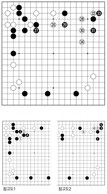 백26으로 뛰어 둔 것은 수비를 하면서 우상 쪽에 침입을 노린 수. 곧바로 <참고도1> 등으로 싸우는 것은 흑4까지 아무래도 백이 무리한 싸움이다. 흑27로 늘어 둔 것 역시 힘을 비축한 점. 역으로 백이 27로 젖히면 일거에 백은 두터운 모습이 된다.