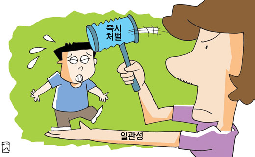 아이들을 교육하는 데 칭찬이라는 당근이 얼마나 좋은지 알면서도 처벌이라는 채찍이 가지고 있는 신속한 효과 때문에 부지불식간에 채찍을 사용하기도 합니다. 어쩔 수 없이 사용하든 혹은 효과적이기 때문에 사용하든 이왕 처벌을 한다면 제대로 처벌하는 것이 바람직하겠지요.