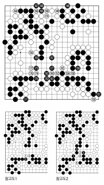 반대로 흑이 둔 것과는 적지 않은 차이다. 게다가 후수로 막아야 한다는 점이 흑으로서는 쓰라리다. 만일 흑이 손을 빼면 <참고도1> 백1로 들여다보는 순간 흑 대마 전체가 위험해진다. 흑175역시 어쩔 수 없는 후퇴.<참고도2> 흑1로 끊어도 백6까지 백의 요석이 살아간다.