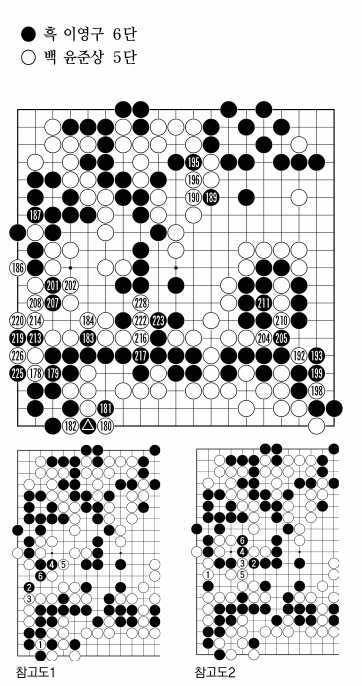 흑181로 전체 대마의 사활을 걸고 패를 결행한 것이 이영구 6단의 처절한 승부호흡. 여기서 더 이상 물러서면 다시는 기회가 찾아오지 않는다는 것을 동물적인 감각으로 느낀 것이다. 그러나 문제는 과연 흑이 충분한 팻감을 확보하고 있느냐이다. 흑201이 교묘한 팻감.<참고도1> 백1로 패를 해소하고 싶은 생각이 들게 하는 장면이다. 그러나 막상 백으로서도 흑2,4,6을 당하고 나면 전체 대마의 안형이 불확실해진다. 물론 이런 변화는 이영구 6단의 입장에서는 대환영이다. 수순 중 백5대신 <참고도2> 백1로 흑 한점을 잡는 것은 흑2로 차단해 바둑이 일거에 끝난다.