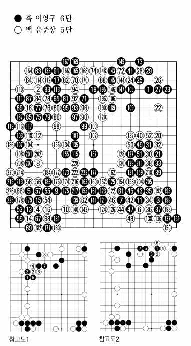 돌을 거두고 난 뒤 이영구 6단은 초반접전에 대해 아쉬움을 표했다. 백이 상변을 침투한 장면에서 <참고도1> 흑1로 어깨를 짚은 수가 백2의 반격을 불러 고전의 원인이 되었다는 것이다. 물론 흑도 백의 좌변 보고를 깨면서 살았지만 아무래도 흑의 손실이 좀더 컸다는 결론이다. 따라서 <참고도1> 흑1로는 <참고도2> 흑1로 붙여 바꿔치기를 하는 편이 나았다는 것이 두 기사의 국후 감상. 하지만 프로의 실전심리상 흑1처럼 상대의 형태를 결정지어 주는 수를 두기는 쉽지 않다.